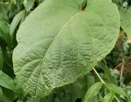 叶为纸质,无托叶,倒阔卵形至倒卵形或阔卵形至近圆形,长6-17厘米,宽7-15厘米,顶端截平形并中间凹入或具突尖、急尖至短渐尖,基部钝圆形、截平形至浅心形,边缘具脉出的直伸的睫状小齿,腹面深绿色,无毛或中脉和侧脉上有少量软毛或散被短糙毛,背面苍绿色,密被灰白色或淡褐色星状绒毛,侧脉5-8对,常在中部以上分歧成叉状,横脉比较发达,易见,网状小脉不易见;叶柄长3-6(-10)厘米,被灰白色茸毛或黄褐色长硬毛或铁锈色硬毛状刺毛。