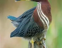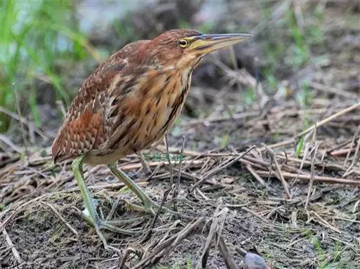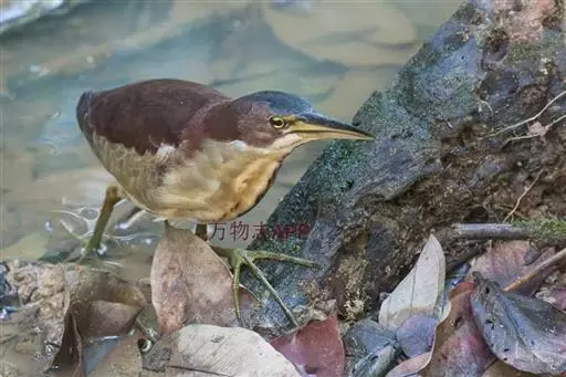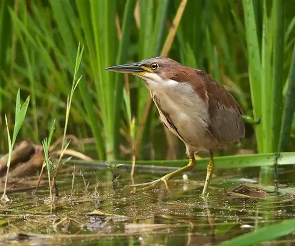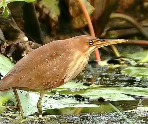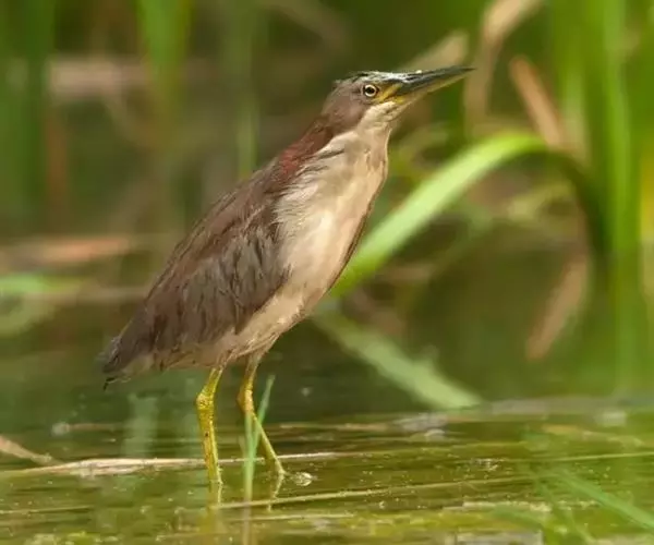 紫背苇鳽是一种中型涉禽。雄鸟上体紫栗褐色,头顶较暗,呈暗栗褐色,背紫栗色。腿和尾上覆羽暗栗褐色。尾羽和飞羽黑褐色.翅上小覆羽暗栗色,中覆羽和大覆羽橄榄灰黄色,初级覆羽黑褐色,羽端白色;颊和颈侧紫栗色。下体土黄色,自颏经前颈到胸部中央有一暗色纵纹,喉侧、颈侧浅土黄白色,胸侧有黑褐色斑点。尾下覆羽白色,翅下覆羽淡黄白色,腋羽灰白色。