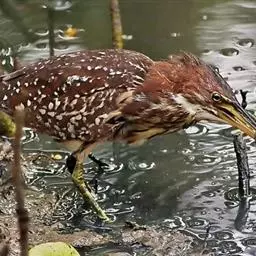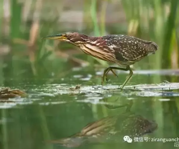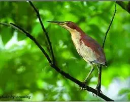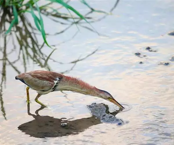 紫背苇鳽(学名:Ixobrychus eurhythmus)为涉禽,体长约33厘米。头顶黑色,后头至尾上覆羽暗栗褐色;翅上覆羽橄榄黄色;下体浅棕黄色。多生活于水库和山脚边的稻田、芦苇丛、滩涂及沼泽草地,在西藏见于海拔2300米的农田,营巢于草丛或苇丛中。食物种类为鱼、虾,育雏中、后期食物种类除鱼、虾之外,还有较多的蛙、蝌蚪、泥鳅及其他水生昆虫。分布于亚洲东部,包括马来西亚、巽他群岛、菲律宾、台湾及中国大陆的东北、华北、浙江、长江流域、福建、四川、西藏、云南、华南及海南等地。