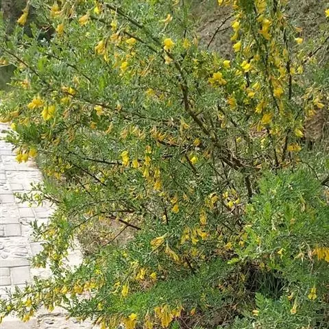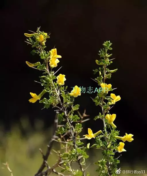 灌木,高0.7-1.5厘米,由基部多分枝。老枝深灰色,一年生枝浅褐色,嫩枝有条棱,被伏贴短柔毛。羽状复叶有 (2) 3-4(5)对小叶;托叶在长枝者硬化成针刺,长2-5毫米,宿存,短枝者脱落;叶轴在长枝者硬化成针刺,长1.5-4厘米,宿存,粗壮,短枝者纤细,脱落;小叶倒卵形、狭倒卵形或长圆形,长4-12毫米,宽3-5毫米,先端钝,有刺尖,基部稍狭,两面近无毛或疏被短伏贴柔毛。花梗单生,长1-2.5厘米,中上部具关节,苞片早落;花萼钟状管形,长6-10毫米,近无毛;花冠黄色,长26-30毫米,旗瓣宽卵形,翼瓣长圆形,瓣柄长约为瓣片的1/3-1/2,耳齿状,龙骨瓣的瓣柄长约为瓣片的3/4,耳短小,子房近无毛。荚果长2-3厘米,宽约4毫米。花期4-5月,果期7月 。