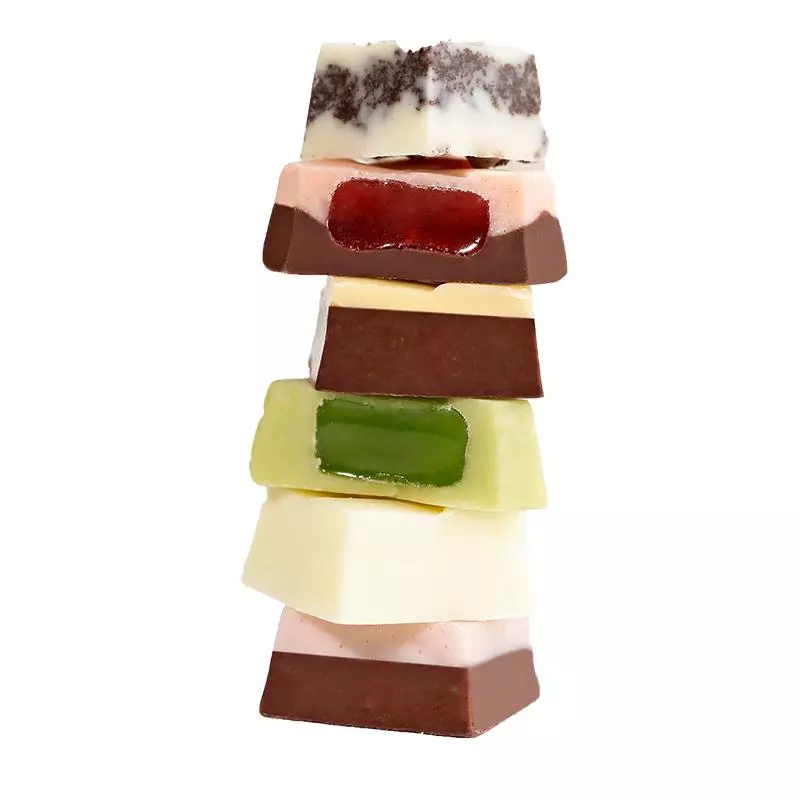 此类巧克力讲究的是在细滑的巧克力外,还有另一种咀嚼的快感。同时因内容物的关系,果仁的味道会中和掉巧克力的甜腻。另外还有包有饼干类内容物(EnrobedorMouldedProductswithBakeryCenters)的巧克力,如金莎、Twix等,饼干的酥脆和细滑的巧克力形成对比。酒心巧克力(在巧克力中注进各式酒类)也是一种夹心巧克力,比较流行的有朗姆酒、伏特加、XO、樱桃酒夹心。轻轻咬下,流动的美酒再加上慢融化的巧克力,那种满口芳香和果仁的脆感截然不同。