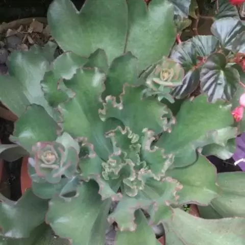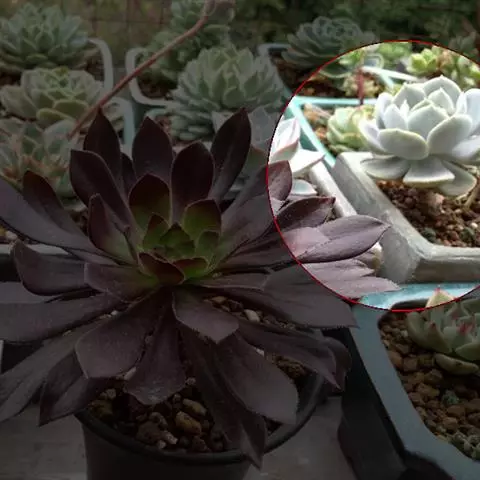 古紫和黑王子有点像,但其叶片更尖,株型更大,叶片叶宽倒披针形,尖端锐利,叶色绿色到黑色,通常黑色,株型较大。古紫春末夏初开花,聚伞花序腋生,小花钟型,前端5裂,猩红色。