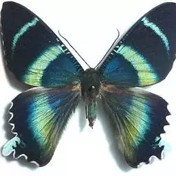 天堂凤蝶翅展可达105mm。前、后翅自基角至后缘约1/2~2/3端为纯净的宝蓝色,后角至后缘1/3…