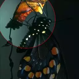 蛹在羽化前变为淡黑色,半个小时内可以羽出。成虫羽出后约1一2个小时才展翅完全,此时活动能力很强,可喂10%的蜜糖水补充营养。