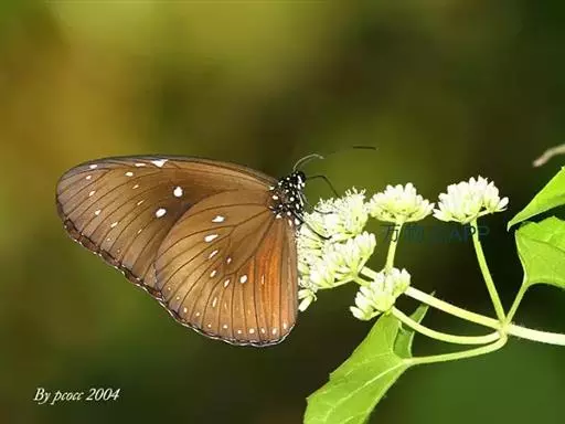 雄蝶翅暗褐色,基部较深,向端部渐浅,蓝色光泽弱,前翅后缘向外凸呈阔弧形,中室端部上和下均有1个白点,近顶端1个不明显,外缘白点列不明显,亚端部有5一6个白点,在CU2室中部有1个短的性标斑;后翅前缘灰白色,外缘和亚外缘白点列不显。翅反面棕色;前翅后缘灰白色有光泽,中室内和外各有1个白点;后翅外缘和亚外缘各有1列白斑,中室内有1个白点,中室端部外附近有白点。 雄雌色彩斑纹基本相似,但雌蝶前翅后缘平直,无性标斑。