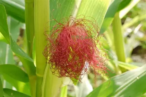玉米 一年生高大草本。秆直立,通常不分枝,高1-4米,基部各节具气生支柱根。叶鞘具横脉;叶舌膜质,长约2毫米;叶片扁平宽大,线状披针形,基部圆形呈耳状,无毛或具疵柔毛,中脉粗壮,边缘微粗糙。顶生雄性圆锥花序大型,主轴与总状花序轴及其腋间均被细柔毛;雄性小穗孪生,长达1厘米,小穗柄一长一短,分别长1-2毫米及2-4毫米,被细柔毛;两颖近等长,膜质,约具10脉,被纤毛;外稃及内稃透明膜质,稍短于颖;花药橙黄色;长约5毫米。雌花序被多数宽大的鞘状苞片所包藏;雌小穗孪生,成16-30纵行排列于粗壮之序轴上,两颖等长,宽大,无脉,具纤毛;外稃及内稃透明膜质,雌蕊具极长而细弱的线形花柱。颖果球形或扁球形,成熟后露出颖片和稃片之外,其大小随生长条件不同产生差异,一般长5-10毫米,宽略过于其长,胚长为颖果的1/2-2/3。染色体2n=20,40,80 (Sarma et Sharma, 1986; Molina, 1986)。花果期秋季。