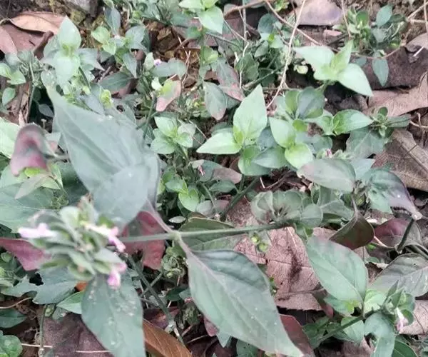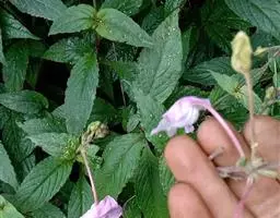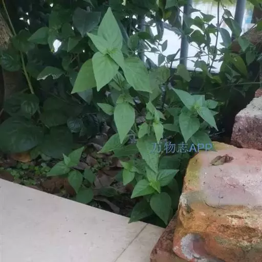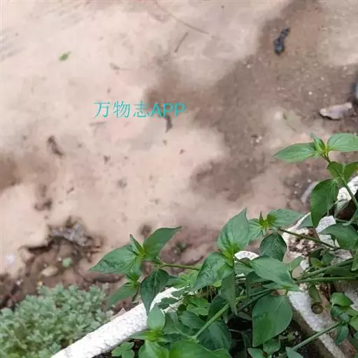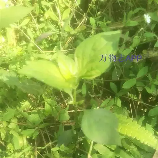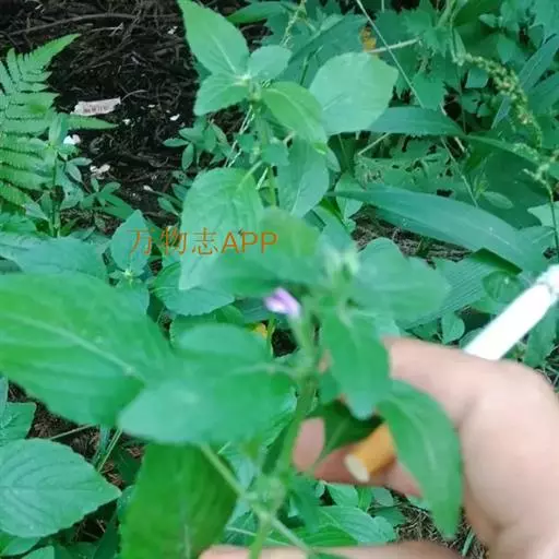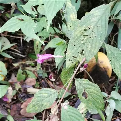草本,高30-80厘米;茎外倾或上升,具6条钝棱和浅沟,节常膨大膝曲状,近无毛或节处被疏柔毛。叶卵状椭圆形,顶端短渐尖,基部阔楔形或稍下延,长2-7厘米,宽1.5-3.5厘米,纸质,绿深色,两面近无毛或背面脉上被疏柔毛;叶柄长5-25毫米。花序腋生或顶生,由3-4个聚伞花序组成,每个聚伞花序有1至少数花,具长3-5毫米的总花梗,下面有2枚总苞状苞片,总苞片阔倒卵形或近圆形,稀披针形,大小不等,长6-12毫米,宽3-7毫米,顶端有小凸尖,具脉纹,被柔毛;小苞片线状披针形,长约4毫米;花萼裂片5,钻形,长约4毫米;花冠淡紫红色,长约10-12毫米,外面被柔毛,2唇形,上唇阔卵状近圆形,全缘,有紫红色斑点,下唇长圆形,3浅裂;雄蕊2,花丝被柔毛,药室2,卵形,一上一下。蒴果长约6毫米,被柔毛,开裂时由蒴底弹起,具种子4粒。