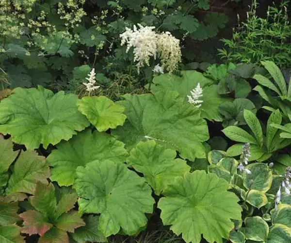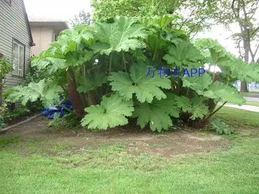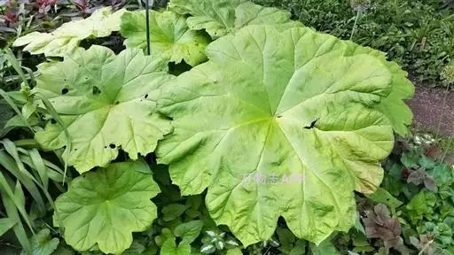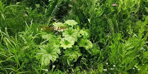 大叶子:又名山荷叶、佛爷伞。多年生草本,高1-1.5m。根茎粗壮,暗褐色,长达35cm,节上生不定根。茎不分枝,下部疏生短硬腺毛。基生叶单一,盾状着生;叶柄长30-60cm,基部扩大成鞘状,抱茎,被刺状硬腺毛;叶片近圆形或卵圆形,直径18-60(-100)cm,掌状浅裂,宽卵形,先端急尖或短渐尖,常再浅裂,边缘具不规则重锯齿,两面被短硬毛;茎生叶较小,掌状3-5浅裂,基部楔形或截形。圆锥花序顶生,长15-20cm;花小,白色或微带紫色;萼片4-5,卵形,先端钝或微凹,背面疏生近无柄之腺毛,5脉与先端汇合;花瓣4-5;雄蕊8;心皮2,下部合生,子房半下位。蒴果。种子狭卵形,具翅。花期6-7月,果期8-9月。