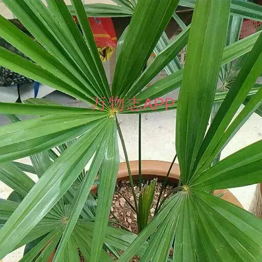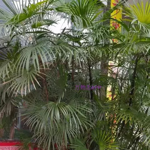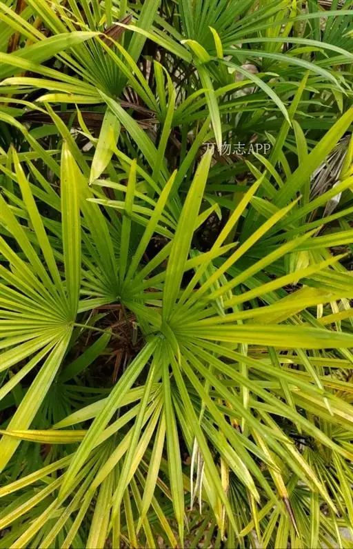 常绿丛生灌木。茎丛生,株高1-3米,被叶鞘细纤维所包裹。叶扇形,掌状深裂,裂片25-31枚,狭线形,劲直伸展,边缘有小齿,两侧及中间一片最宽,叶柄边缘稍锐利,有淡黄色密绒毛。果椭圆形,花期3-4月。