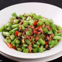 榄菜四季豆是以牛肉馅、四季豆为主料,盐、洋葱为配料制作而成的菜品。