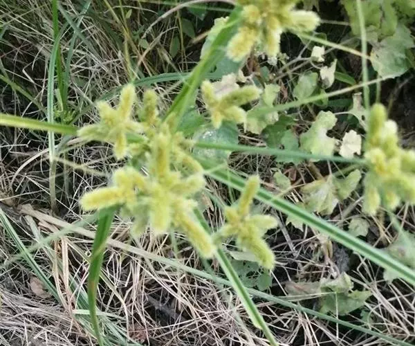 头状穗莎草为草本植物。有须根,叶红棕色,果实为长圆形和三稜形。
