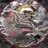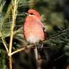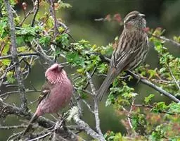 红腰朱雀:体长12-14厘米,小型鸟类。雄鸟前额和眉纹玫瑰粉红色,头顶和一宽的贯眼带深红褐色,背红…