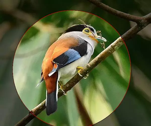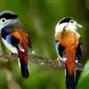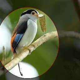 银胸丝冠鸟(学名:Serilophus lunatus)是雀形目阔嘴鸟科的鸟类,在全世界共分化为10个亚种。体长16-18厘米。嘴宽阔、天蓝色,基部橙色。鼻孔圆形具宽阔的黑色眉纹。上背烟灰色,下背至尾上覆羽栗色,两翅的翼缘白色,翼角羽缘缀浅灰蓝色,覆羽和羽端均为亮黑色,翅膀表面具有显著的亮蓝色和白色翼镜。尾羽黑色,中央两对纯黑,第三对多少沾一些白色,其余尾羽均具宽阔的白色端斑,呈凸尾型。跗蹠和趾蓝绿色。属热带森林鸟类,栖息于海拔90-1400米热带、亚热带地区的各种类型的树林中,主要以昆虫为食,也吃植物果实。