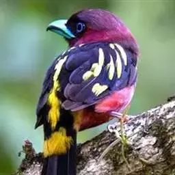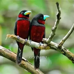 长尾阔嘴鸟是雀形目阔嘴鸟科的鸟类,体长约25厘米,是绿色阔嘴鸟。形长的楔形尾蓝色,喉及脸黄色,顶冠…