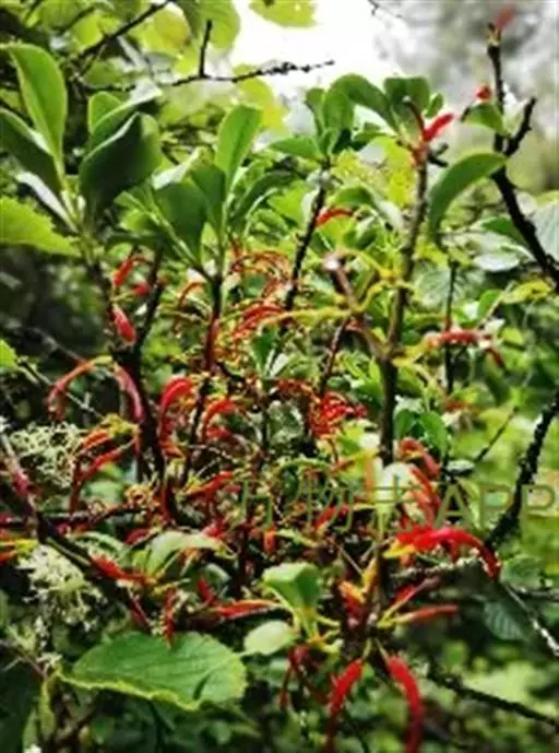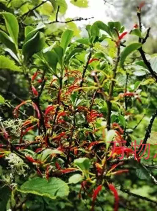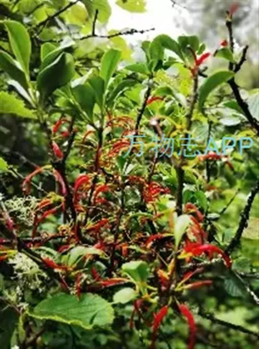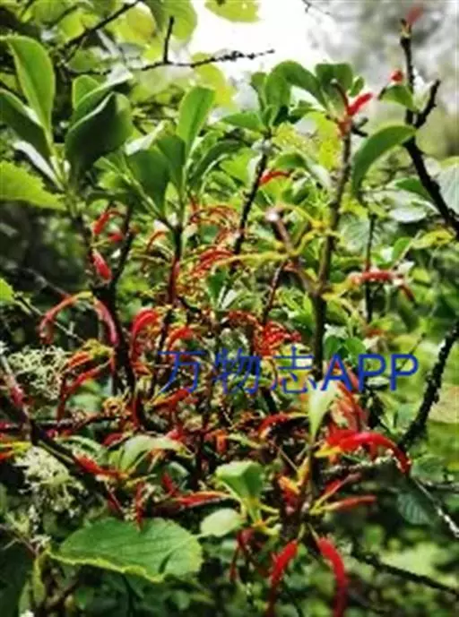 柳叶钝果寄生 灌木,高0.5-1米,全株无毛;二年生枝条黑色,具光泽。叶互生,有时近对生或数枚簇生于短枝上,革质,卵形、长卵形、长椭圆形或披针形,长3-5厘米,宽1.5-2厘米,顶端圆钝,基部楔形,稍下延;侧脉3-4对,叶柄长2-4毫米。伞形花序,1-2个腋生或生于小枝已落叶腋部,具花2-4朵,总花梗长1-2毫米或几无,花梗长4-6毫米;苞片卵圆形,长约2毫米;花红色,花托椭圆状,长约2.5毫米.浅齿,稀具撕裂状芒;花冠花蕾时管状,长2-3厘米,稍弯,顶部椭圆状,裂片4枚,披针形,长6-9毫米,反折;花丝长约2毫米,花药长3-4毫米;花柱线状,柱头头状。果椭圆状,长8-10毫米,直径4毫米,黄色或橙色。花期2-7月,果期5-9月。