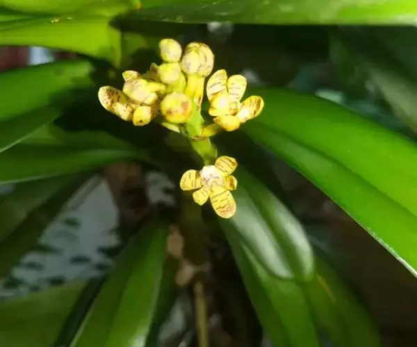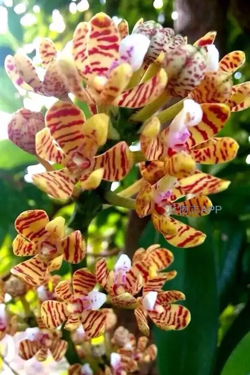 多花脆兰(Acampe rigida (Buch.-Ham. ex J. E. Smith) P. F. Hunt),又名黑山蔗、蕉兰、香蕉兰和脆兰,兰科脆兰属大型附生植物。茎粗壮,近直立,长达1米,叶近肉质,带状,斜立,花黄色带紫褐色横纹,不甚开展,具香气,萼片和花瓣近直立,花瓣狭倒卵形,唇瓣白色,厚肉质,3裂,蒴果近直立,圆柱形或长纺锤形,花期8-9月,果期10-11月。多花脆兰性喜阴,忌阳光直射,喜湿润,忌干燥,15℃至30℃最宜生长,常附生于海拔560-1600米的林中树干上或林下岩石上。多花脆兰产于我国,印度、缅甸、泰国、老挝等国也有分布。多花脆兰花瓣黄色并嵌有深红色条纹和斑点,唇瓣白色,风韵高雅,是兰科植物中极富观赏性的一种兰花,另外,多花脆兰具有较高的药用价值,其叶入药,外用治跌打损伤、骨折等。