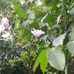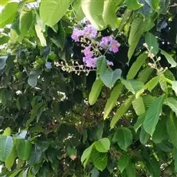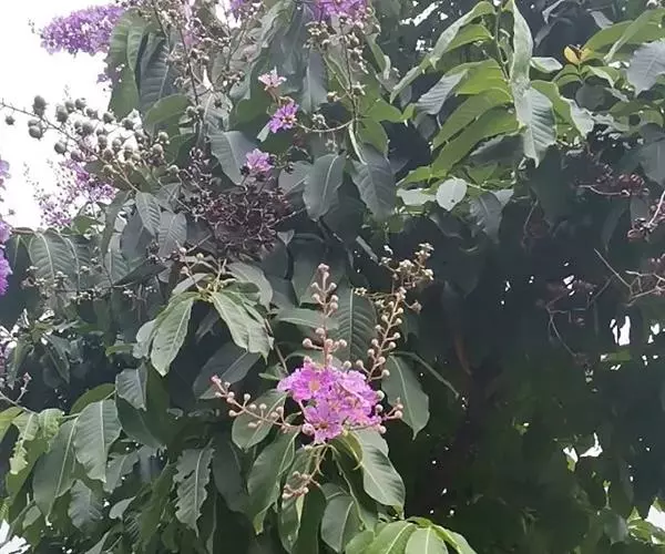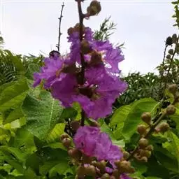 大花紫薇,别名:大叶紫薇,拉丁文名:Lagerstroemia speciosa Pers.千屈菜科、紫薇属大乔木,高可达25米;树皮灰色,平滑;小柱圆柱形,无毛或微被糠批状毛。叶革质,矩圆状椭圆形或卵状椭圆形,稀披针形,甚大,顶端钝形或短尖,基部阔楔形至圆形,两面均无毛,蒴果球形至倒卵状矩圆形,褐灰色,种子多数,花期5-7月,果期10-11月。 常栽培庭园供观赏;木材坚硬,耐腐力强,色红而亮,常用于家具、舟车、桥梁、电杆、枕木及建筑等,也作水中用材,其木材经济价值据云可与袖木相比;树皮及叶可作泻药;种子具有麻醉性;根含单宁,可作收敛剂。