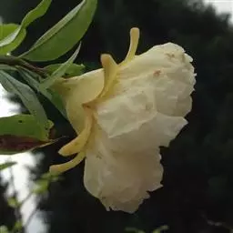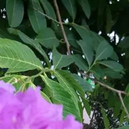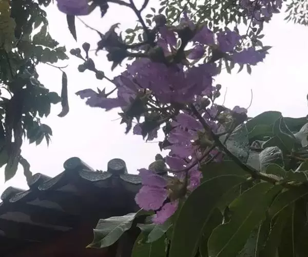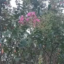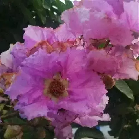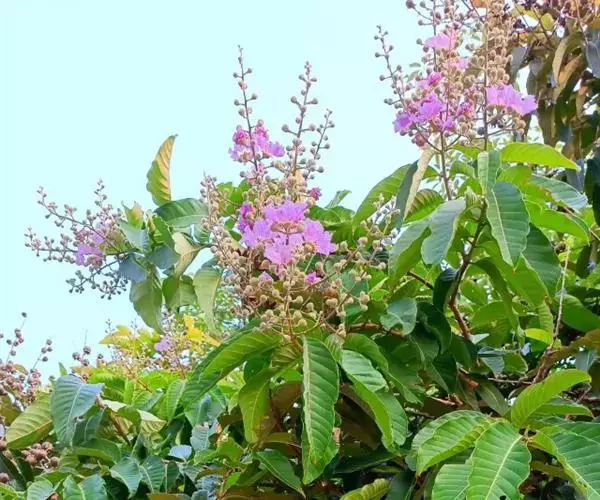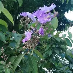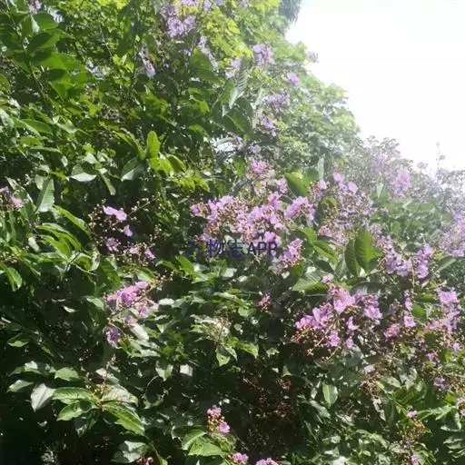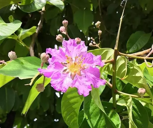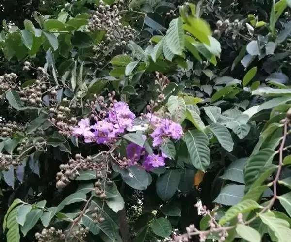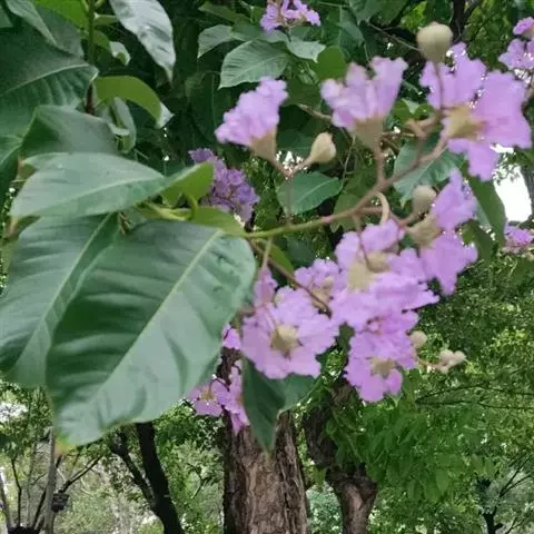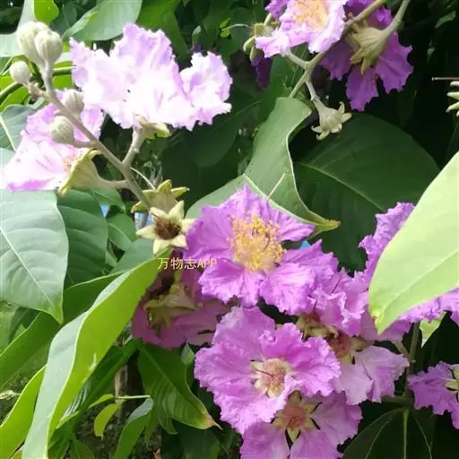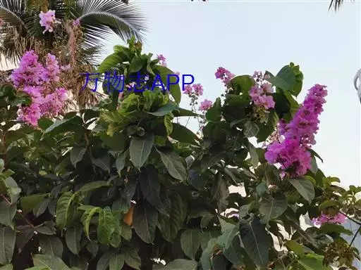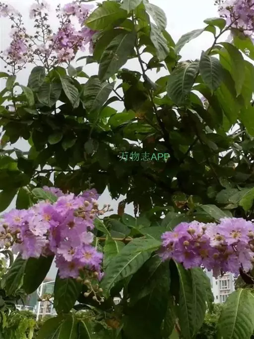 大花紫薇 大乔木,高可达25米;树皮灰色,平滑;小柱圆柱形,无毛或微被糠批状毛。叶革质,矩圆状椭圆形或卵状椭圆形,稀披针形,甚大,长10-25厘米,宽6-12厘米,顶端钝形或短尖,基部阔楔形至圆形,两面均无毛,侧脉9-17对,在叶缘弯拱连接;叶柄长6-15毫米,粗壮。花淡红色或紫色,直径5厘米,顶生圆锥花序长15-25厘米,有时可达46厘米;花梗长1-1.5厘米,花轴、花梗及花萼外面均被黄褐色糠粃状的密毡毛;花萼有棱12条,被糠粃状毛,长约13毫米,6裂,裂片三角形,反曲,内面无毛,附属体鳞片状;花瓣6,近圆形至矩圆状倒卵形,长2.5-3.5厘米,几不皱缩,有短爪,长约5毫米;雄蕊多数,达100-200;子房球形,4-6室,无毛,花柱长2-3厘米。蒴果球形至倒卵状矩圆形,长2-3.8厘米,直径约2厘米,褐灰色,6裂;种子多数,长10-15毫米。花期5-7月,果期10-11月。