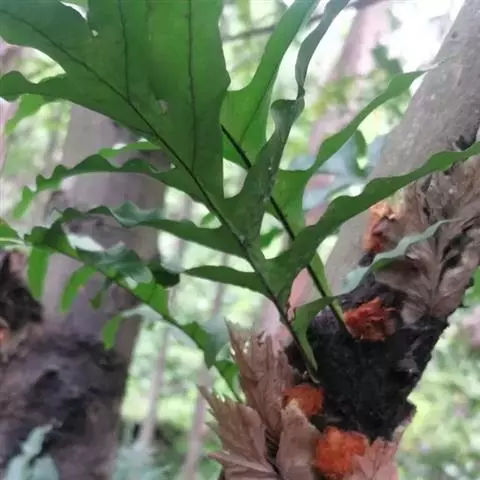 多年生附生草本,高25–50厘米。根状茎粗壮;长而横走,密披棕褐色鳞片;鳞片线状钻形,边缘有不广卵形,长5–10厘米,宽3–6厘米,先端急尖,基部心40厘米,宽14–18厘米,具有狭翅的柄,羽状深裂,裂片7–13对,互生,阔披针形,长7–9厘米,宽2–3厘米,先端急尖或钝,下部羽片缩短,基部各羽片缩成耳状,厚纸质,绿色,无毛;叶脉明显,网状,粗而凸起。孢子囊群盖。孢子成熟期10–11月。