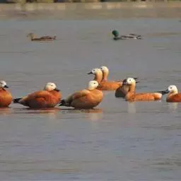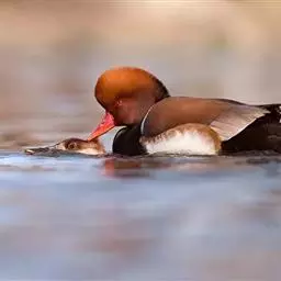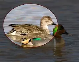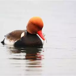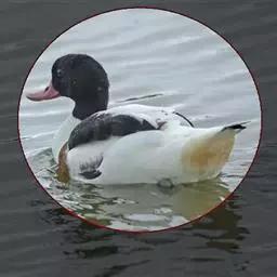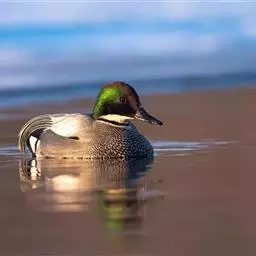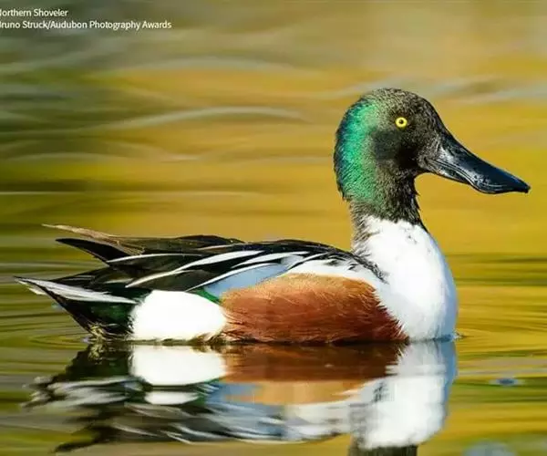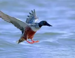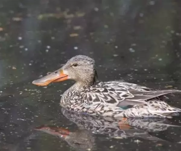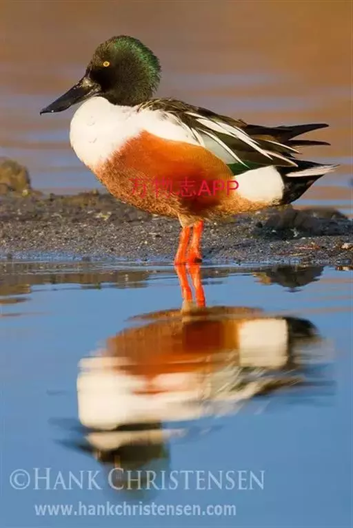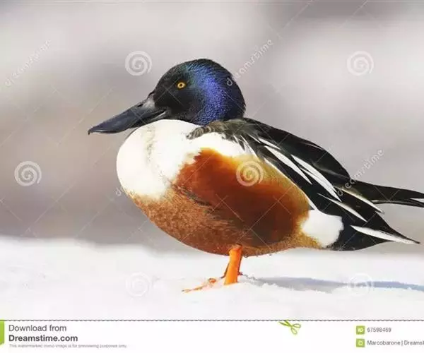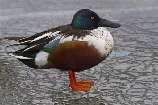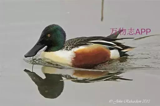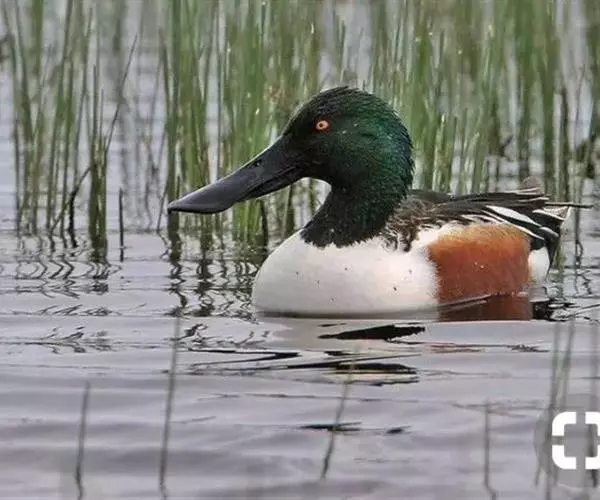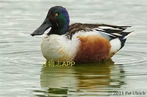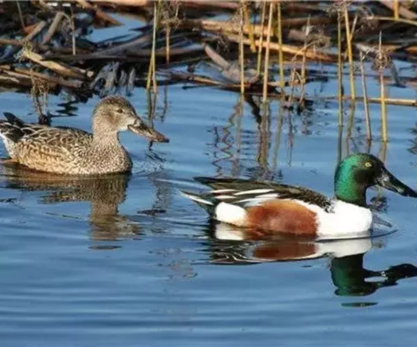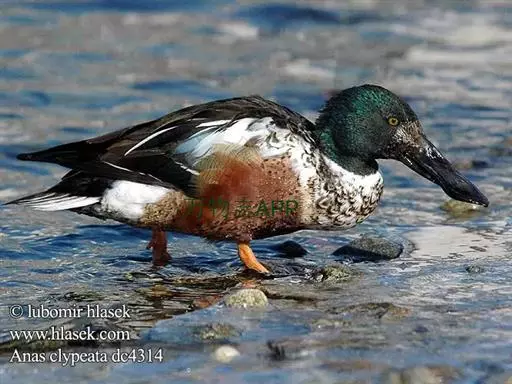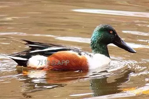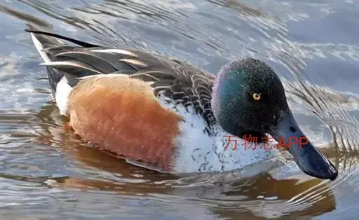 琵嘴鸭(学名:Anas clypeata):属中型鸭类,个体比绿头鸭稍小,体长43-51厘米,体重0.5千克左右。雄鸭头至上颈暗绿色而具光泽,背黑色,背的两边以及外侧肩羽和胸白色,且连成一体,翼镜金属绿色,腹和两胁栗色,脚橙红色,嘴黑色,大而扁平,先端扩大成铲状,形态极为特别。雌鸭略较雄鸭为小,外貌特征亦不及雄鸭明显,也有大而呈铲状的嘴。