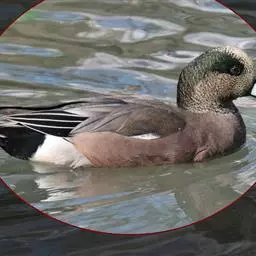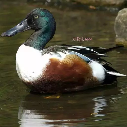 琵嘴鸭 琵嘴鸭雄鸟头、颈暗绿色;额、眼、头顶、颏和喉较深暗,呈黑褐色。背暗褐色,具淡棕色羽缘;上背两侧和外侧肩羽白色,其余肩羽除2枚较长的内侧肩羽外翈为蓝灰色外,均为黑褐色,并闪绿色光彩,中间有一条宽的白色羽轴纹,沿羽干直达羽尖。腰暗褐色,微具绿色光泽;腰两侧白色,尾上覆羽金属绿色,中央尾羽暗褐色,具白色羽缘。外侧尾羽白色,具稀疏的褐色斑点。翅上小覆羽和中覆羽灰蓝色;大覆羽暗褐色,具白色端斑。初级飞羽暗褐色,羽干白色;次级飞羽外翈翠绿色,形成绿色翼镜,内翈暗褐色,端斑白色,形成翼镜后缘白边,前缘白边由大覆羽白色端斑构成;三级飞羽黑褐色,具绿色光泽和宽阔的白色中央纹。下颈和胸白色,并向上扩展到背侧与背两侧的白色相连为一体。两胁和腹栗色,下腹微具褐色波状细斑。较短的尾下覆羽基部白色而有黑色细斑,端部黑色;较长的呈纯黑色,仅羽端有细小白色斑点。