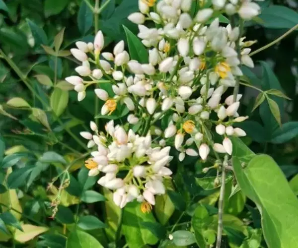 圆锥花序直立,长20-35厘米;花小,白色,具芳香,直径6-7毫米;萼片多轮,外轮萼片卵状三角形,长1-2毫米,向内各轮渐大,最内轮萼片卵状长圆形,长2-4毫米;花瓣长圆形,长约4.2毫米,宽约2.5毫米,先端圆钝;雄蕊6,长约3.5毫米,花丝短,花药纵裂,药隔延伸;子房1室,具1-3枚胚珠。果柄长4-8毫米;浆果球形,直径5-8毫米,熟时鲜红色,稀橙红色。种子扁圆形。花期3-6月,果期5-11月。