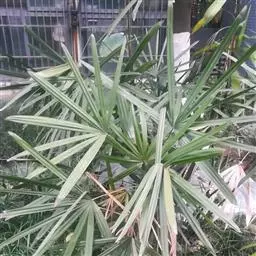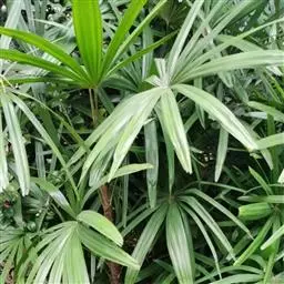 矮棕竹(学名:Rhapis humilis Bl.):丛生灌木,高1米或更高些,茎圆柱形,有节,上部被紧密的网状纤维的叶鞘,纤维毛发状,淡褐色。叶掌状深裂,裂片7-20片,线形,具1-2条肋脉,叶柄约与叶片等长,较细,两面凸起,边缘平滑。花雌雄异株,花序梗及每分枝基部为一个佛焰苞包着,小花枝纤细,枝条各部分被锈色鳞秕状绒毛;花蕾时为卵形,花萼杯状钟形,具不整齐的3裂。种子球形,直径约4.5毫米。花期7-8月。