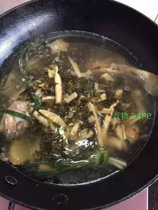 6. 焖至汤如白奶,鱼眼凸出、剞纹绽裂时,加入芥菜梗段、笋片、葱结、精盐,用旺火烧开,再加味精,盛入大汤碗中即成。