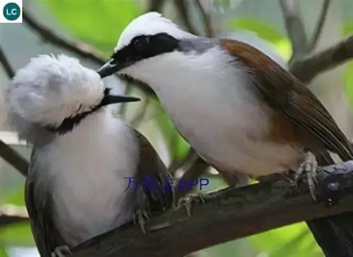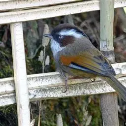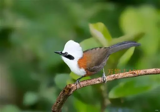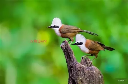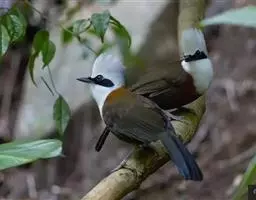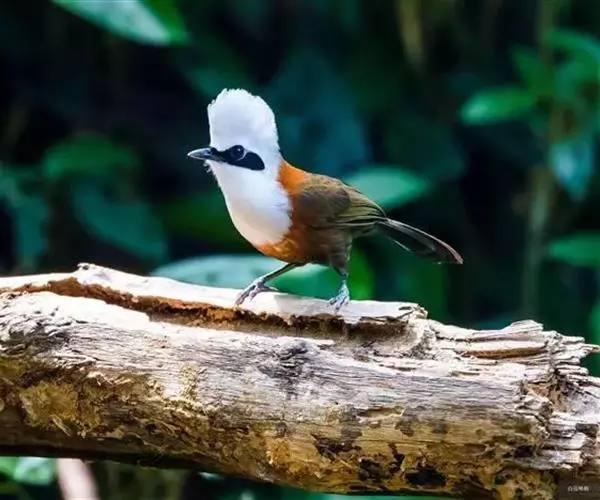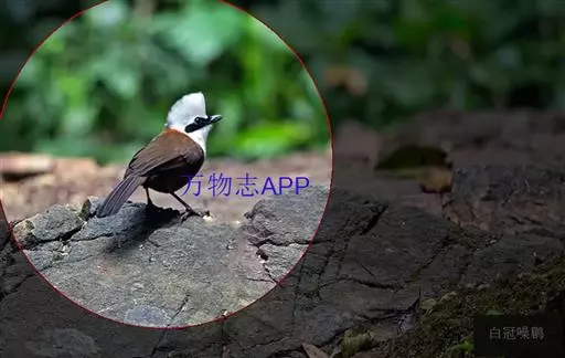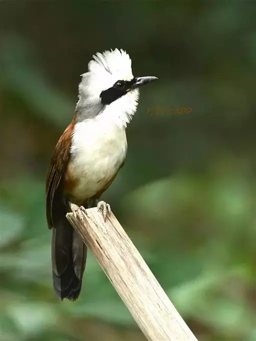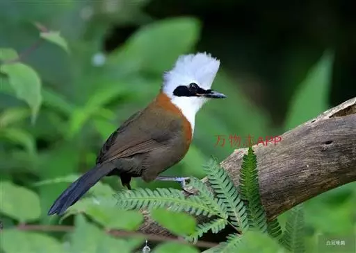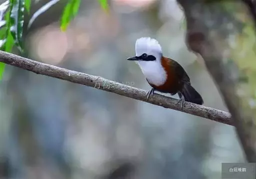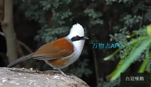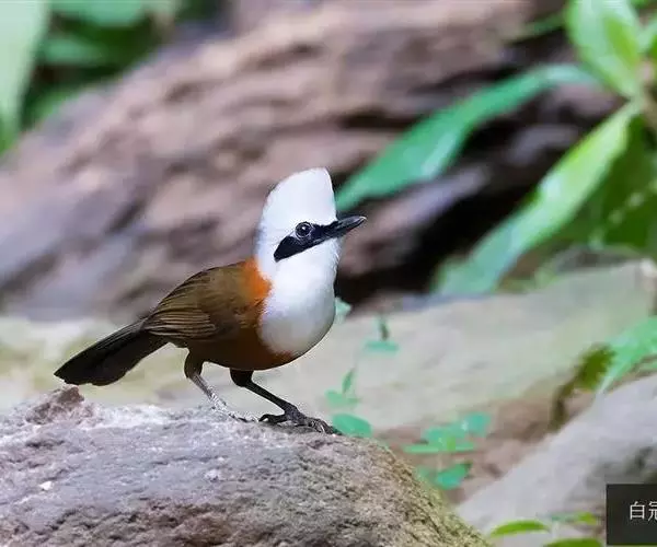 白冠噪鹛 白冠噪鹛雌雄羽色相似。整个头、头侧、羽冠以及颏、喉和上胸白色;前额基部、眼先、眼周和耳羽黑色,形成一条宽阔的黑色贯眼纹,在白色头部极为醒目;最长的冠羽后部逐渐变为灰色或棕灰色,紧靠头部白色之后有一锈红色或棕栗色领圈,沿颈侧延伸至同色的下胸,领圈后的上下体羽概为橄榄褐色。滇南亚种无领圈,白色头部后的后颈呈灰色或蓝灰色,背栗褐色往后渐淡,下体几全为白色,仅两胁和尾覆羽棕色;两翅和尾暗褐色微缀橄榄褐色。虹膜红褐色或棕红色,嘴黑色,脚黑灰色至淡褐色。