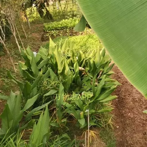 植株高2.5-4米。叶片长圆形,长2-3米,宽25-30厘米,先端钝,基部圆形或不对称,叶面鲜绿色,有光泽;叶柄粗壮,长达30 厘米。