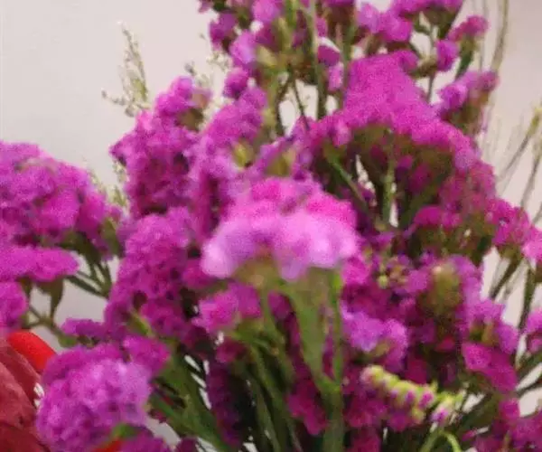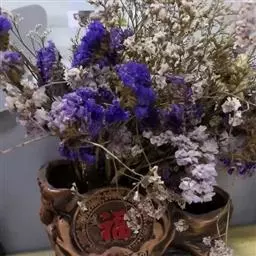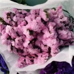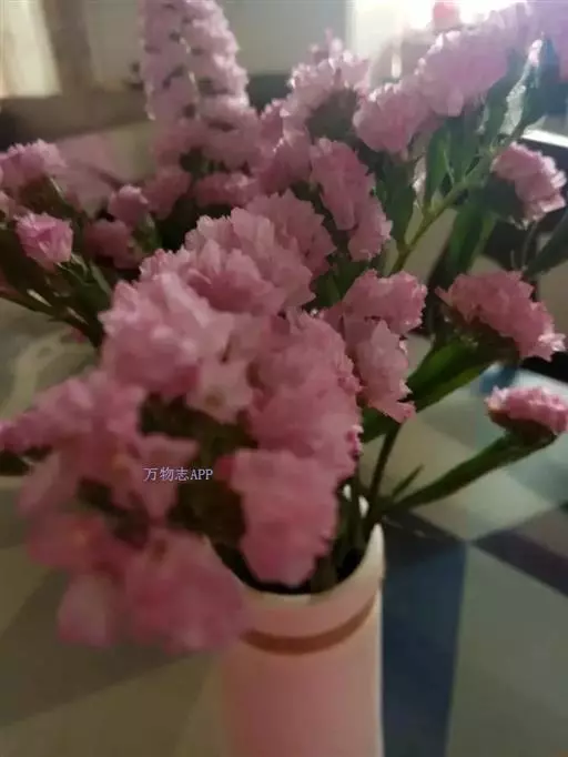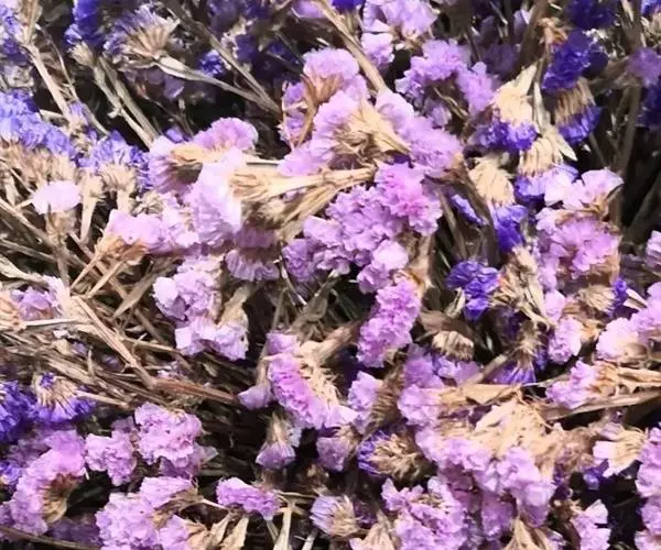 补血草(学名:Limonium sinense(Girard.) Kuntze),原产地中海地区,多年生草本,常作二年生栽培,全株具糙毛。叶丛生于茎基部,叶片大头羽裂。花序自基部分枝,呈伞房状聚伞圆锥花序,疏松,开张,花枝长,可达1米,花序枝具3~5翼,小花穗上有3~5朵花,着生于短而小的花一侧;花萼管状,干膜质,有紫、淡紫、玫瑰粉、蓝、红、白、黄各色。