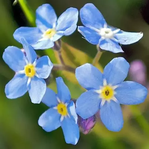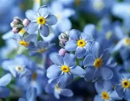 勿忘草 勿忘草株形柔美,茎枝纤细,叶片的形状很像柳树的叶子,无数朵小蓝花开满茎顶部的每个小枝,花瓣的蓝色仿佛是由天空的颜色染成的让人充满无限遐想。花朵中央有一圈黄色心蕊色彩搭配非常和谐。