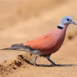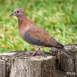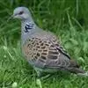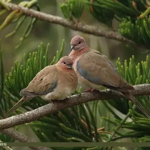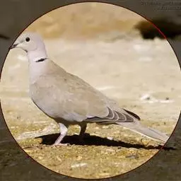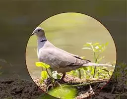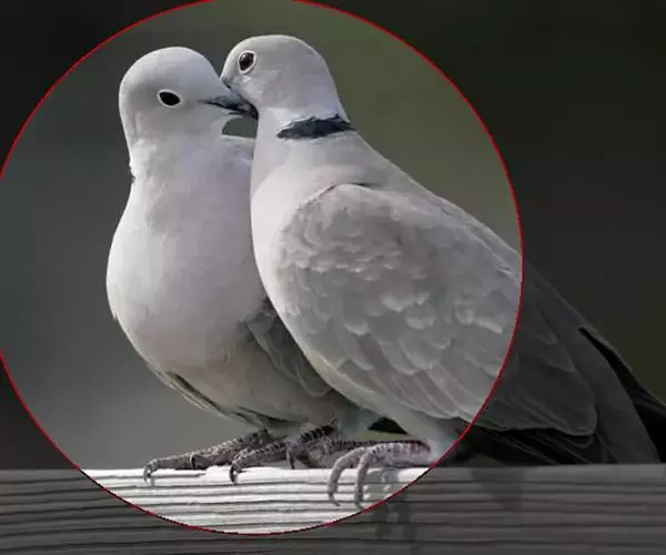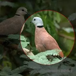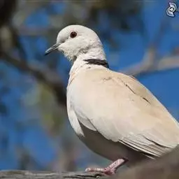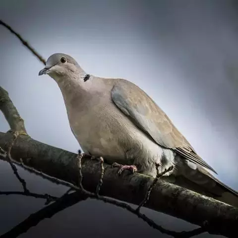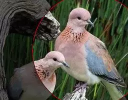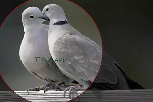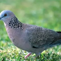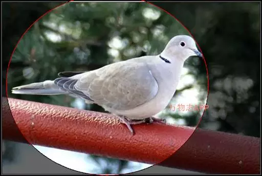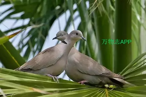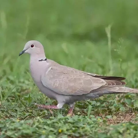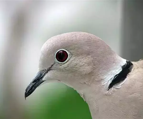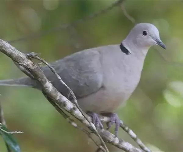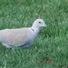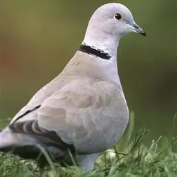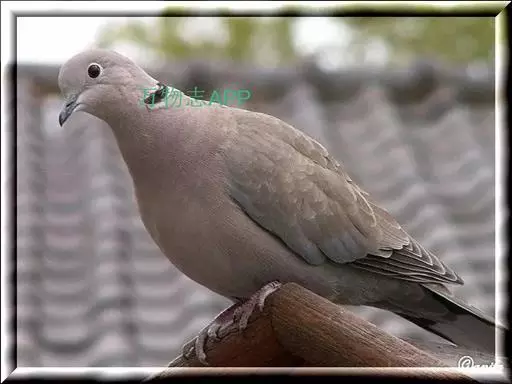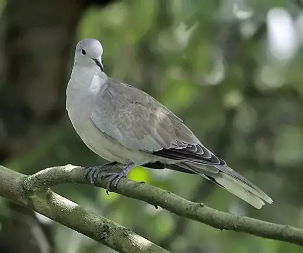 灰斑鸠(学名:Streptopelia decaocto):其全身灰褐色,翅膀上有蓝灰色斑块,尾羽尖端为白色,颈后有黑色颈环,环外有白色羽毛围绕。虹膜红色,眼睑也为红色,眼周裸露皮肤自包或浅灰色,嘴近黑色,脚和趾暗粉红色。