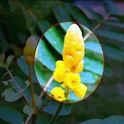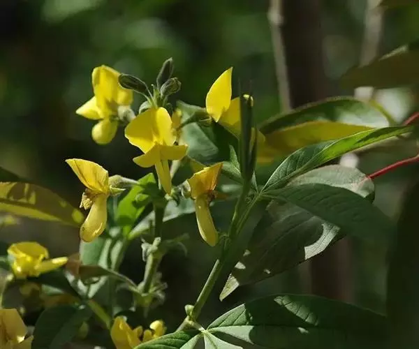 花冠黄色,旗瓣阔心形,瓣片长约2.5厘米,宽2厘米,先端凹,瓣柄长约6毫米,翼瓣稍短,长约2.3厘米,宽8毫米,先端钝圆,龙骨瓣长约3厘米,宽9-10毫米;子房线形,具短柄,密被黄色绢毛,胚珠2-10粒。