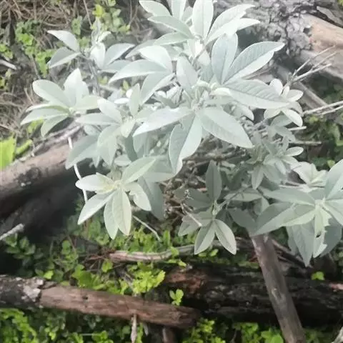 小叶披针形、长圆状椭圆形或线状卵形,长6-14厘米,宽1.5-4厘米,先端渐尖,基部楔形,硬纸质,上面无毛,暗绿色,下面初被黄色丝状毛和白色贴伏柔毛,后渐脱落,呈粉白色,两面平坦,侧脉不隆起。