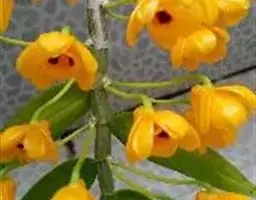 独角石斛,Dendrobium unicum,兰科石斛属植物。花瓣橙黄色,唇瓣反转似犀牛角,…
