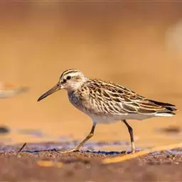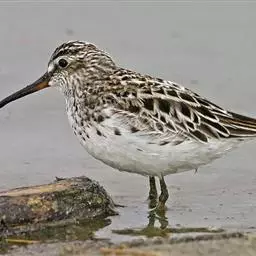 阔嘴鹬是涉禽,体长17厘米。特征为翼角常具明显的黑色块斑并具双眉纹。与黑腹滨鹬平滑下弯的嘴相比,…