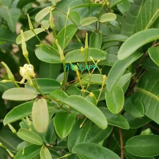 白叶藤 柔弱木质藤本,具乳汁;小枝通常红褐色,直径约1毫米,无毛。叶长圆形,长1.5-6厘米,宽0.8-2.5厘米,两端圆形,顶端具小尖头,无毛,叶面深绿色,叶背苍白色;侧脉纤细,每边5-9条;叶柄长5-7毫米。聚伞花序顶生或腋生,比叶为长;花蕾长圆形,顶端尾状渐尖;花萼裂片卵圆形,长1毫米,花萼内面基部有10个腺体;花冠淡黄色,花冠筒圆筒状,长5毫米,花冠裂片长圆状披针形或线形,比花冠筒长2倍,向右覆盖,顶端旋转;副花冠裂片卵圆形,生于花冠筒内面;花粉器匙形,粘于柱头上;心皮离生,无毛,花柱短,柱头宽圆锥状。蓇葖长披针形或圆柱状,长达12.5厘米,直径6-8毫米;种子长圆形,长约1厘米,宽2毫米,棕色,顶端具白色绢质种毛。花期4-9月,果期6月-翌年2月。