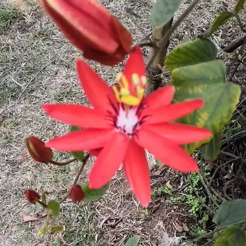 红花西番莲(Passiflora coccinea Aubl.) ,又名洋红西番莲,是西番莲科,西番莲属 的多年生常绿蔓性藤本植物,蔓长可达数米。幼茎近圆形,老茎三棱形。叶互生,长卵形。花单生于叶腋,花瓣长披针形,先端微急尖,稍外向下垂,红色。副花冠3轮,最外轮较长,紫褐色并散布有斑点状白色,内两轮为白色。果卵圆形。