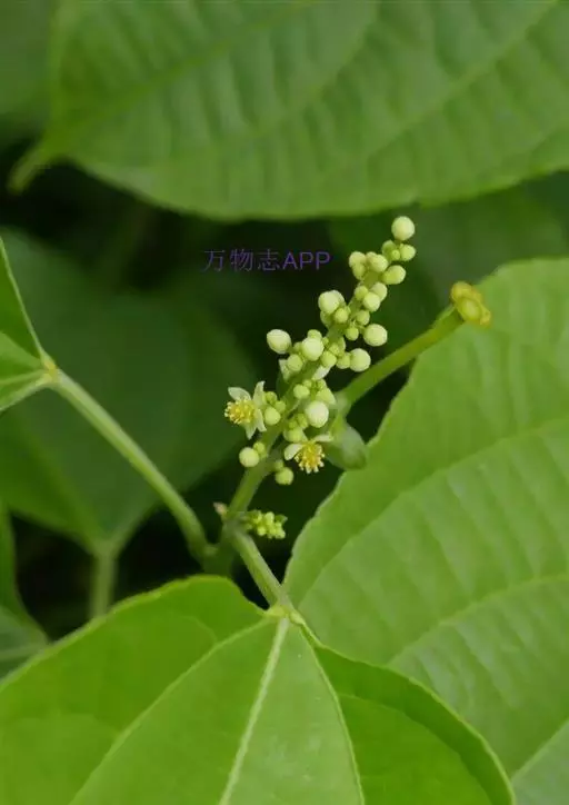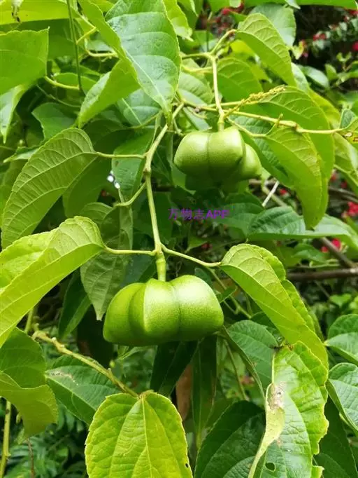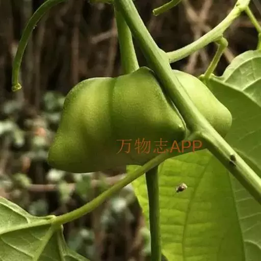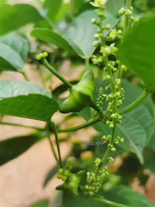 多年生木质藤本植物,长可达3米以上。叶互生,具柄,卵圆形至卵状长圆形,具基出三脉,两面无毛,边缘有锯齿。圆锥花序近似总状,腋生;花单性;雄花多数,生于花序上部,花小,黄白色;雄花1-2朵生于花序下部,花被不明显,花柱粗壮,线形。蒴果星状,具4-6个果瓣,幼时表面光滑、绿色,成熟时茶锅色,每个果瓣内含有1粒种子。花果期几全年。