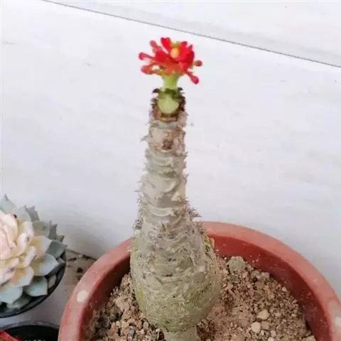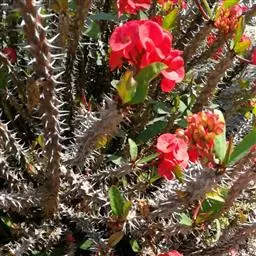 虎刺梅:别称铁海棠,是蔓生灌木植物。茎多分枝,长60-100厘米,直径5-10毫米,具纵棱,密生硬…