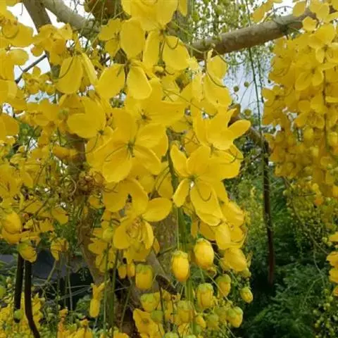 腊肠树(学名:Cassia fistula L.):落叶乔木,高可达15米;枝细长;树皮灰色,老时粗糙,暗褐色。叶长30-40厘米,小叶对生,薄革质,阔卵形,卵形或长圆形,边全缘,幼嫩时两面被微柔毛,老时无毛;叶脉纤细,两面均明显。总状花序长达30厘米或更长,疏散,下垂;花与叶同时开放,直径约4厘米;花瓣黄色,倒卵形,近等大,具明显的脉。荚果圆柱形,长30-60厘米,黑褐色,不开裂,有槽纹;种子40-100颗,横隔膜所分开。花期6-8月;果期10月。