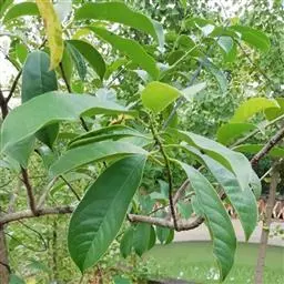 醉香含笑(学名:Michelia macclurei Dandy):乔木,高达30米,胸径1米左右;树皮灰白色,光滑不开裂;芽、嫩枝、叶柄、托叶及花梗均被紧贴而有光泽的红褐色短绒毛。叶革质,倒卵形、椭圆状倒卵形,上面初被短柔毛,后脱落无毛,下面被灰色毛杂有褐色平伏短绒毛。花蕾内有时包裹不同节上2-3小花蕾,形成2-3朵的聚伞花序,花被片白色,通常9片,匙状倒卵形或倒披针形;蓇葖长圆体形、倒卵状长圆体形或倒卵圆形;种子1-3颗,扁卵圆形。花期3-4月,果期9-11月。
