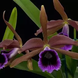 总状花序侧生于茎的上端,长4~8厘米,具3~5朵花,花苞片膜质,浅白色,舟状;花橘黄色,开展;中萼片长圆状椭圆形,先端钝,全缘,极5条脉;侧萼片长圆形,先端钝,具5条脉;花瓣椭圆形或宽椭圆状倒卵形,长2.4~2.6厘米,宽1.4~1.7厘米,先端钝,全缘,具3条脉;唇瓣近圆形,长2.5厘米,宽约2.2厘米,上面具有密布绒毛和一个大的紫色斑块,边缘具不整齐的细齿。花期5-6月。