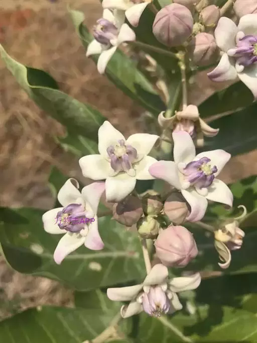 聚伞花序伞形状,腋生和顶生;花序梗和花梗被灰白色绒毛,花梗长2-2.5厘米;花萼裂片卵圆形;花冠紫蓝色,辐状,直径3-4厘米,裂片卵圆形,长1.5厘米,宽1厘米,急尖;副花冠裂片比合蕊柱短,顶端内向,基部有距。蓇葖单生,膨胀,端部外弯,长7-9厘米,直径3厘米,被短柔毛;种子广卵形,长5毫米,宽3毫米,顶端具白色绢质种毛;种毛长2.5厘米。花果期几乎全年。