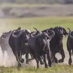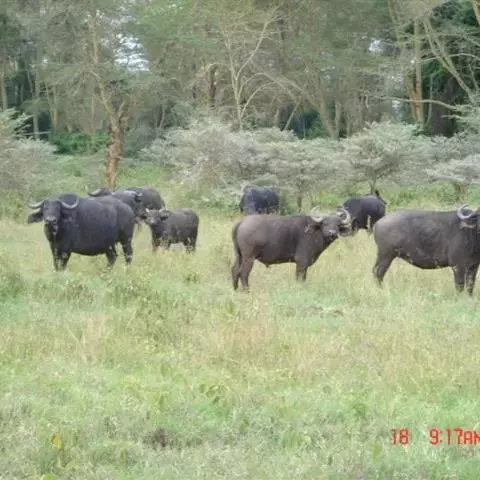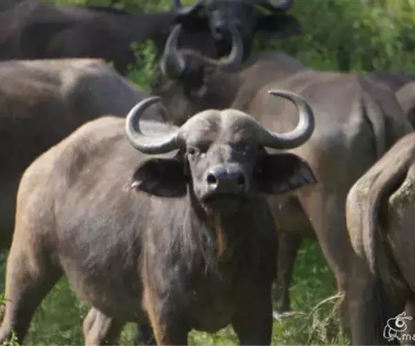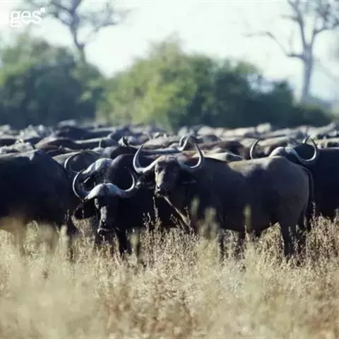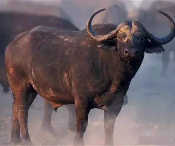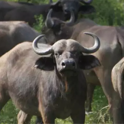 非洲野水牛(学名:Syncerus caffer):共有5个亚种。头体长2.1-3.4米,身高1-1.7米,体重300-900千克。胸膛宽阔,四肢粗壮,头大角长,雄性的角从头部向外和向下扩散,在一些雄性中,角通过覆盖头部的大盾连接。头顶的柔软的毛发附着在大而下垂的耳朵上。身体通常覆盖着稀疏的毛发,通常从棕色到黑色。长尾巴,尾尖处有毛发流苏。雄性个体大于雌性,角也更大更长更厚。而热带草原的种群的体型可以达到森林栖息地的物种的两倍。