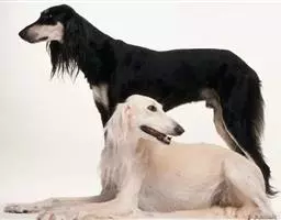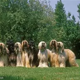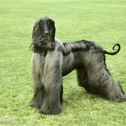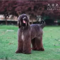 阿富汗猎犬全身披丝绢状的长毛,毛色鲜艳,呈多种颜色,背中线附近毛短,…