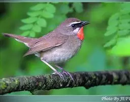 日本歌鸲:体型小似麻雀,但羽毛颜色较为美丽。嘴细长,嘴须不发达;翅短圆,上体草黄褐;雄鸟喉部橙棕色,…