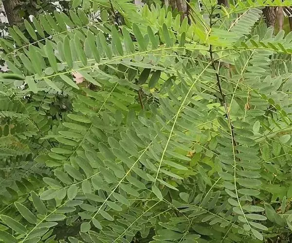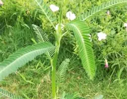 一年生草本,高3-3.5米。茎绿色,有时带褐色红色,微被白粉,有不明显淡绿色线纹。平滑,基部有多数不定根,幼枝疏被白色绢毛,后秃净,折断有白色粘液,枝髓粗大充实。羽状复叶;叶轴长15-25厘米,上面具沟槽,幼时疏被绢毛,后儿无毛;托叶披针形,早落;小叶20-30 (-40)对,对生或近对生,线状长圆形,长8-20 (-40)毫米,宽2.5-4 (-7)毫米,位于叶轴两端者较短小,先端钝至截平,具小尖头,基部圆形,两侧不对称,上面无毛,下面幼时疏被绢毛,后秃净,两面被紫色小腺点,下面尤密;小叶柄长约1毫米,疏被毛;小托叶钻形,短于或几等于小叶柄,宿存。
