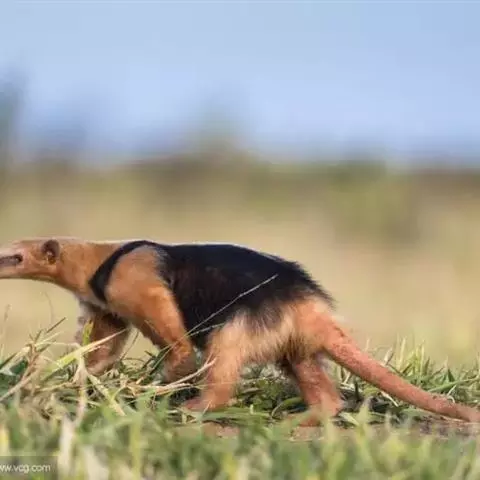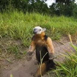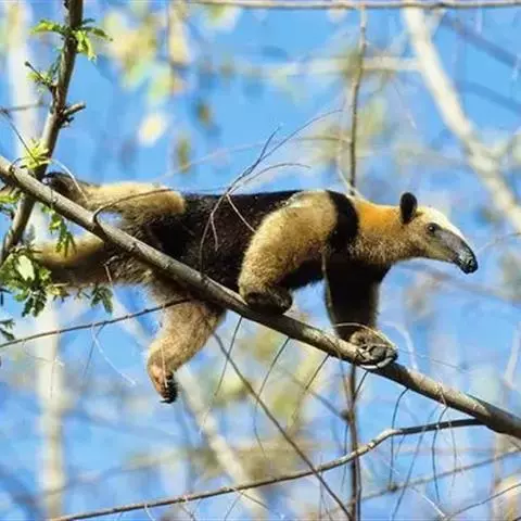 小食蚁兽见于墨西哥、特立尼达、巴西和秘鲁,体形最小,大似松鼠,不过350克,毛较短的,耳朵比较大。前肢的中间3趾有锐爪,第三趾特长,第一趾有小爪,第五趾无爪。后肢也有五趾。但是更为有趣的还是它的尾巴。这条尾巴不仅能缠绕,而且能起支柱作用。每当遇到危险时,它便以尾巴支持后部,半身挺起,宛如一副三角架。一边用前肢来威吓入侵者,一面由嘴里发出一种特殊的哨声,以此达到保卫自己的目的。小食蚁兽是一种既能树栖、又能地栖的动物。白天黑夜都可出来活动。